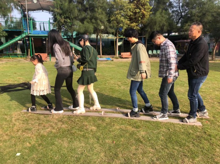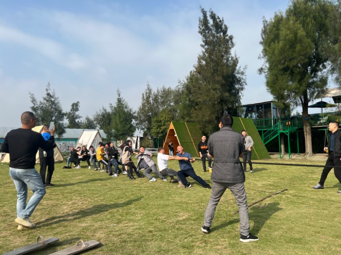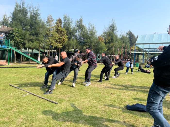 天翁作美,一大早陽光滿溢,在一聲聲加油吶喊中我們開始了本次團(tuán)建活動的第一個項目,選手們緊緊地抓住繩子,個個弓著腿,身子向后倒,有節(jié)奏地喊著:拉!拉!拉!